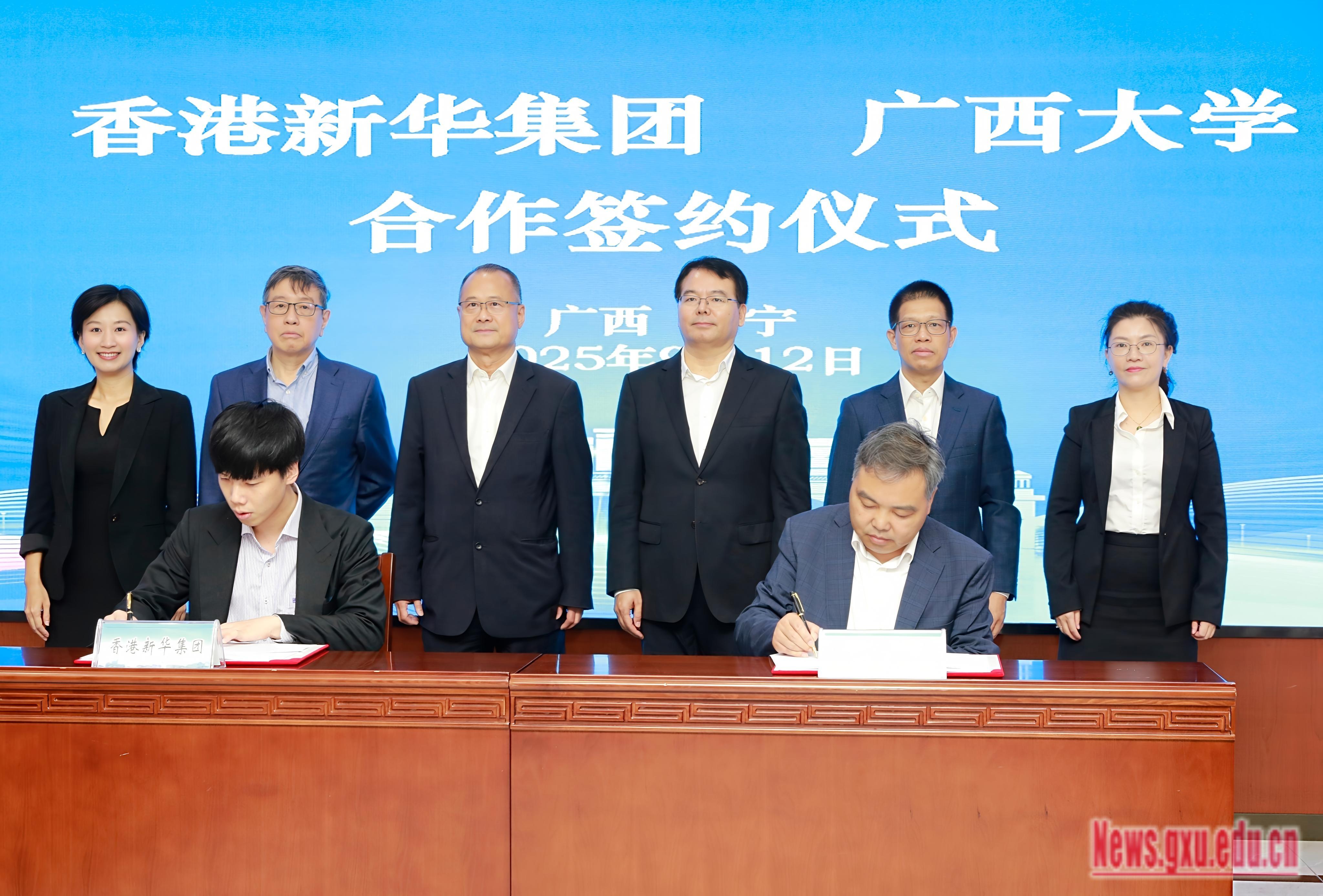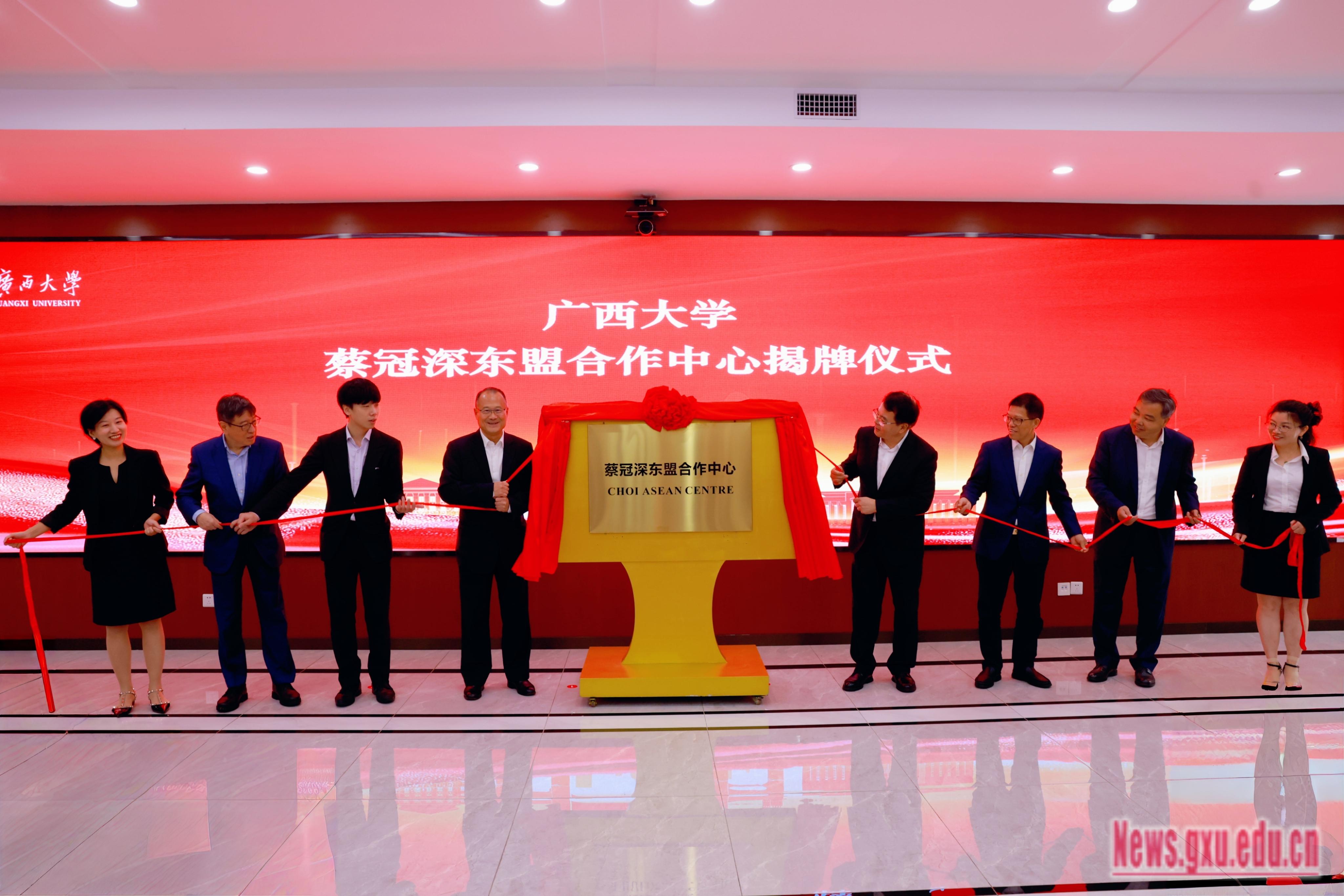 Following the meeting, Xiao Jianzhuang and Cai Zhuosi, Executive Vice Chairman of the Guangdong-Hong Kong-Macao Bay Area Entrepreneurs Alliance and Southeast Asia Regional President of SunWah Group, signed the "Cooperation Agreement between SunWah Group and Guangxi University" on behalf of both parties. Jonathan Choi Koon Shum and Li Guozhong witnessed the signing ceremony and unveiled the plaque for the "Jonathan Choi ASEAN Cooperation Center" at Guangxi University.
