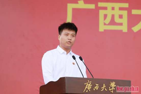 Hiệu trưởng Hàn Lâm Hải có bài phát biểu “Dám làm và làm đúng cách, phấn đấu thêm hồng sắc màu tuổi trẻ”, chào mừng và chúc mừng các tân sinh viên đã gia nhập vào đại gia đình Trường Đại học Quảng Tây, đồng thời bày tỏ sự kính trọng và biết ơn đối với các bậc phụ huynh, thầy cô đã tận tâm bồi dưỡng tân sinh viên. Ông đã giới thiệu về lịch sử phát triển của Đại học Quảng Tây trong hơn 90 năm qua, nhắc lại mục đích thành lập nhà trường “bảo vệ Trung Quốc, phát triển Quảng Tây” của Hiệu trưởng đầu tiên Mã Quân Vũ và nội hàm phong phú và ý nghĩa sâu rộng của phương châm “cần cù, chân thành” của trường. Hiệu trưởng Hàn Lâm Hải chỉ ra rằng, tuổi trẻ ngày nay sống trong thời đại hưng thịnh, đúng là lúc để phấn đấu vươn lên. Thời kỳ đại học là giai đoạn then chốt cho sự trưởng thành của sinh viên, hy vọng các bạn sinh viên có thể nắm bắt tốt các cơ hội để trở thành nhân tài, ghi nhớ sứ mệnh, phấn đấu thêm hồng sắc màu tuổi trẻ, bắt đầu một cuộc sống học tập thật rực rỡ tại Đại Học Quảng Tây. Ông kêu gọi các tân sinh viên quyết tâm phục vụ đất nước, phấn đấu trở thành những người theo đuổi ước mơ vĩ đại, cầm vững gậy tiếp sức của thời đại, kiên định lý tưởng và niềm tin, mang trong lòng “mối quan tâm của nhà nước”, gắn chặt chí hướng cá nhân với vận mệnh đất nước và dân tộc, phấn đấu trở thành những con người mới của thời đại có thể gánh vác nhiệm vụ quan trọng phục hưng dân tộc; trau dồi những bản lĩnh vững chắc và vững vàng, trở thành người thực hành làm việc đến nơi đến chốn, kiên trì và sáng tạo, nỗ lực bền bỉ, nghiêm túc làm việc, kiên trì làm việc đến nơi đến chốn với tinh thần theo đuổi chân lý làm việc thực chất và thái độ đã tốt lại phải tốt hơn, đối mặt trực diện và vượt qua những khó khăn, thách thức trên con đường học tập, mở ra tương lai rực rỡ thuộc về chính mình; chủ động ứng phó với những thách thức của thời đại, dũng cảm làm người tiên phong đổi mới và sáng tạo, khơi dậy tối đa nhiệt huyết sáng tạo và tiềm năng sáng tạo, dũng cảm đi đầu, cách cố đỉnh tân, dùng trí tuệ của tuổi trẻ thúc đẩy tiến bộ xã hội và tạo ra một tương lai tươi đẹp.