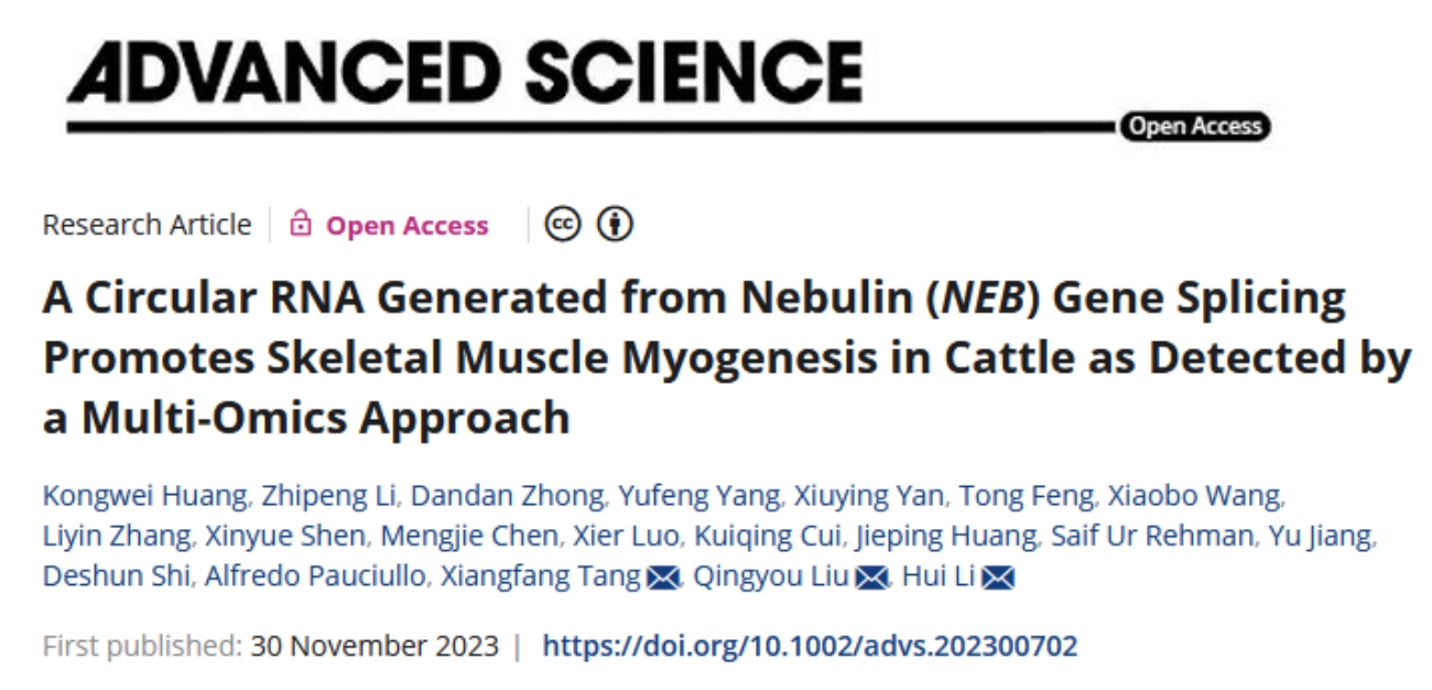 Recently, the "Animal Cloning and Reproductive Regulation" team of the School of Animal Science and Technology of Guangxi University, together with Foshan University, Chinese Academy of Agricultural Sciences and Northwest A&F University, has made great research progress in the functional genome analysis of beef traits. It is published in Advanced Science titled A Circular RNA Generated from Nebulin (NEB) Gene Splicing Promotes Skeletal Muscle Myogenesis in Cattle as Detected Published by a Multi-Omics Approach.