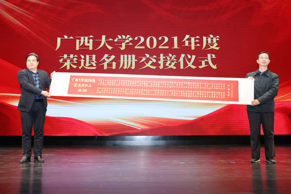 荣退仪式上,人力资源处、离退休工作处进行了sunbet申搏官方网站2021年度荣退名册交接,精致装裱的荣退名册手写着2021年度荣退教职工名字,体现学校对退休教职工几十年兢兢业业为党工作、踏踏实实为校服务的敬重和肯定。