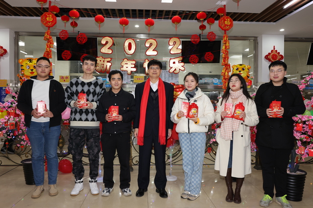 在sunbet申搏官方网站萃苑餐厅,罗廷荣代表学校向留校过年的同学们送上新春的问候与祝福,为同学们分发“春节红包”和“福袋”,为近两天过生日的2名同学庆生,与大家同唱生日歌、同切生日蛋糕,并与同学们一起吃年夜饭,拉家常、话发展。