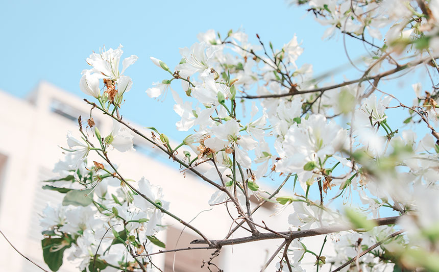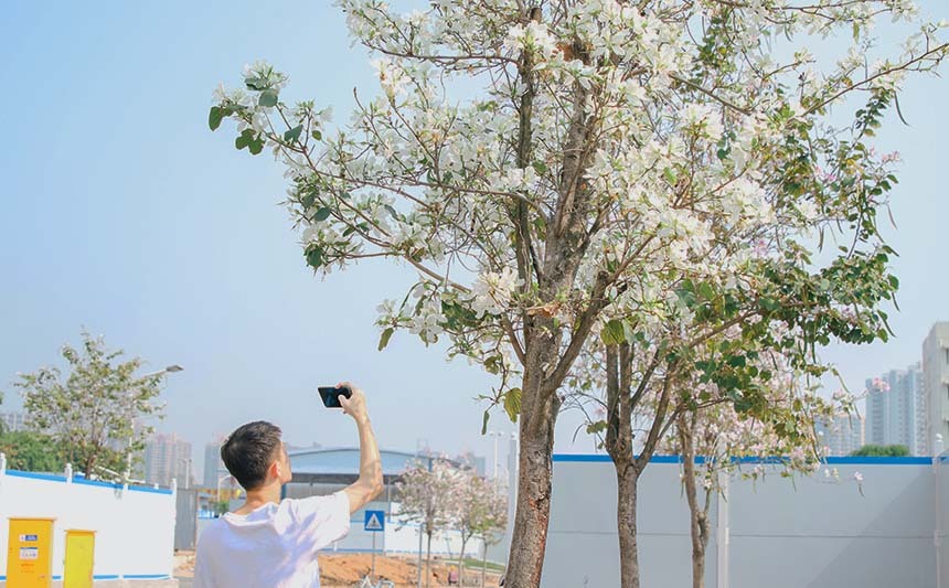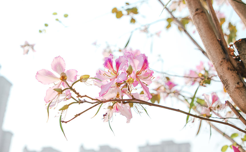近日,sunbet申搏官方网站迎来花期。洋紫荆、三角梅、朱瑾等花朵相继绽放,点缀了校园的春天,共同构成了一道秀丽的风景线,不时引来行人驻足观赏,拍照留念。图为蓝天下的白洋紫荆。