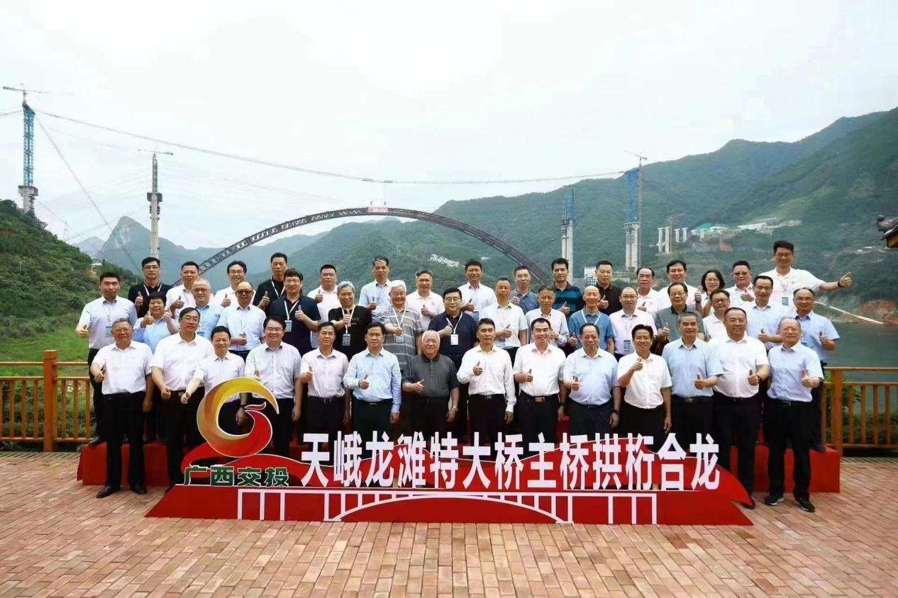 广西壮族自治区政协副主席、sunbet申搏官方网站党委书记王乃学(前排左八),郑皆连院士(前排左七)与大桥建设团队在天峨龙滩特大桥施工现场(sunbet申搏官方网站供图)