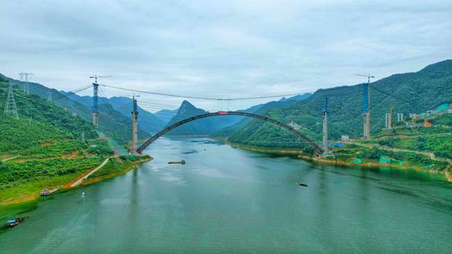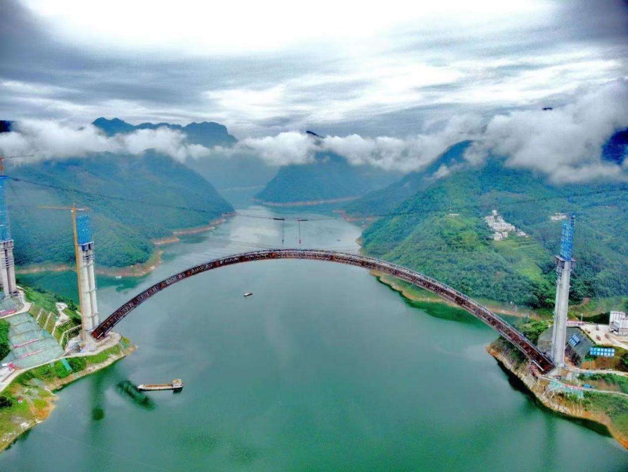 天峨龙滩特大桥位于广西河池市天峨县龙滩水库,是南丹至天峨下老高速公路控制性工程、西部陆海新通道高速公路上的一座上承式劲性骨架混凝土拱桥。天峨县是广西最后三个没有通高速的县域之一,目前正在修建的南丹至天峨下老高速公路将改变这一局面。而天峨龙滩特大桥是这条高速公路上的一个重点控制性工程,大桥全长2488.55米。其中,主桥采用上承式劲性骨架混凝土拱桥方案,跨径600米,建成后将成为世界最大跨径拱桥,把混凝土拱桥跨径的世界纪录提高了155米。该桥跨度大,设计、施工难度极高,将成为拱桥建造史上的又一里程碑,同时对于国家战略“一带一路”南向东盟、川藏铁路、西部陆海新通道沿线桥梁工程的建设具有引领性的示范作用。