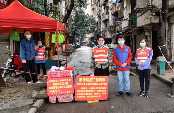 与南宁市五里亭社区工作人员共同抗击疫情。