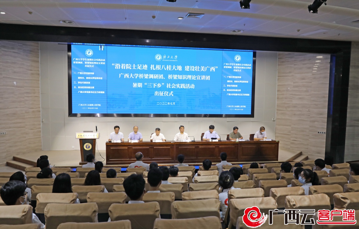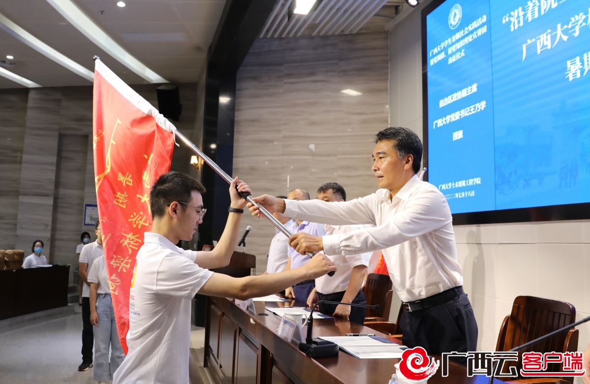 7月18日,“沿着院士足迹、扎根八桂大地、建设壮美广西”sunbet申搏官方网站桥梁调研团、桥梁知识理论宣讲团暑期“三下乡”社会实践活动出征仪式在土木建筑工程学院举行。自治区政协副主席、sunbet申搏官方网站党委书记王乃学出席出征仪式并为实践队授旗。