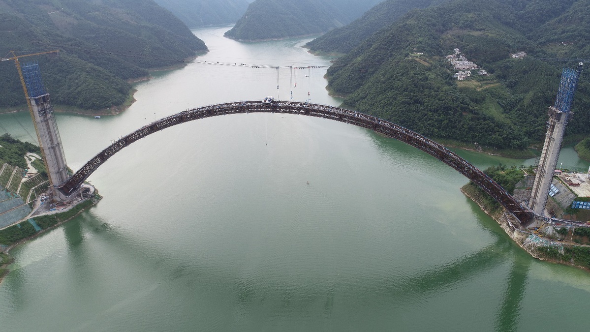外包混凝土浇筑是摆在团队面前的另一个难题。“项目最大的困难在于对后续外包混凝土方案的编制。”项目部副总工程师叶增鑫介绍。与一般的钢管混凝土拱桥的施工流程相比,这种使用上承式劲性骨架修建的混凝土拱桥多了一个外包混凝土的施工环节。施工团队将在8000吨的钢骨架上浇筑28000多立方米重达7万多吨的混凝土,施工技术要求高、难度大。