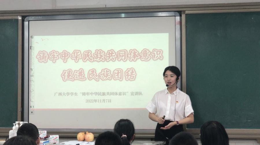 以“石榴”为媒,用微宣讲搭建起中学生思政课堂。“我们此次微宣讲不是单纯的理论灌输,而是从中学生感兴趣的内容入手,结合广西民族团结进步工作的成就,学生们自己的亲身见闻,用‘石榴’这个具体的物品为媒介,开展微宣讲,以更好地理解党的二十大报告中‘以铸牢中华民族共同体意识为主线,全面推进民族团结进步事业’。”学生宣讲队指导教师陆秀红教授谈到。