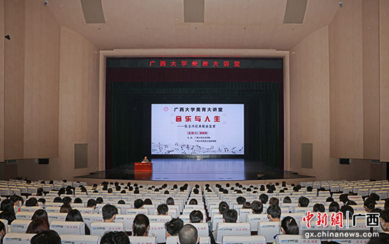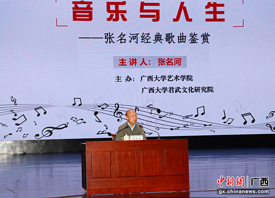 中新网广西新闻11月16日电(欧阳宜文)11月15日,全国著名词作家、国家一级编剧张名河受邀到sunbet申搏官方网站开展“美育大讲堂”讲座,以“音乐与人生”为主题,畅谈其三十多年来文学艺术创作的心路历程,并与在场400余名师生共同赏鉴了其创作的《有一个美丽的传说》《二泉吟》《不朽的黄河》等多首脍炙人口的著名歌曲,生动地展示出一部当代中国歌曲史上“不老的传说”。