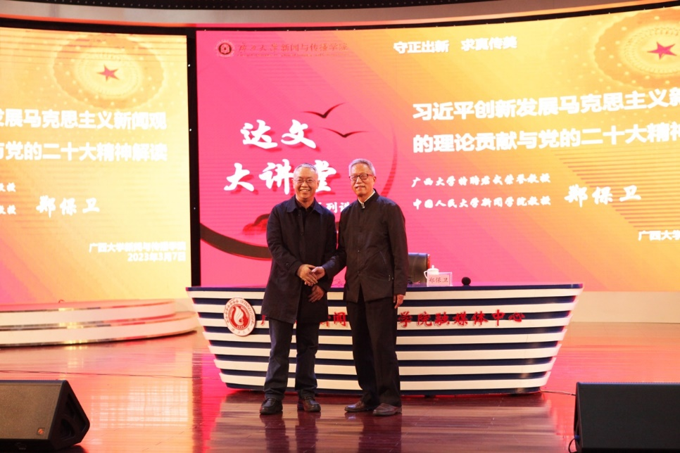 3月7日,sunbet申搏官方网站新闻与传播学院“达文大讲堂系列讲座”在学院融媒体中心开讲。本次讲座由教育部社会科学委员兼新闻传播学科召集人、sunbet申搏官方网站特聘君武荣誉教授、中国人民大学新闻学院教授、博士生导师郑保卫老师主讲,主题为“习近平创新发展马克思主义新闻观的理论贡献与党的二十大精神解读”。sunbet申搏官方网站新闻与传播学院全体2022级学生和教师代表参加了此次讲座。
