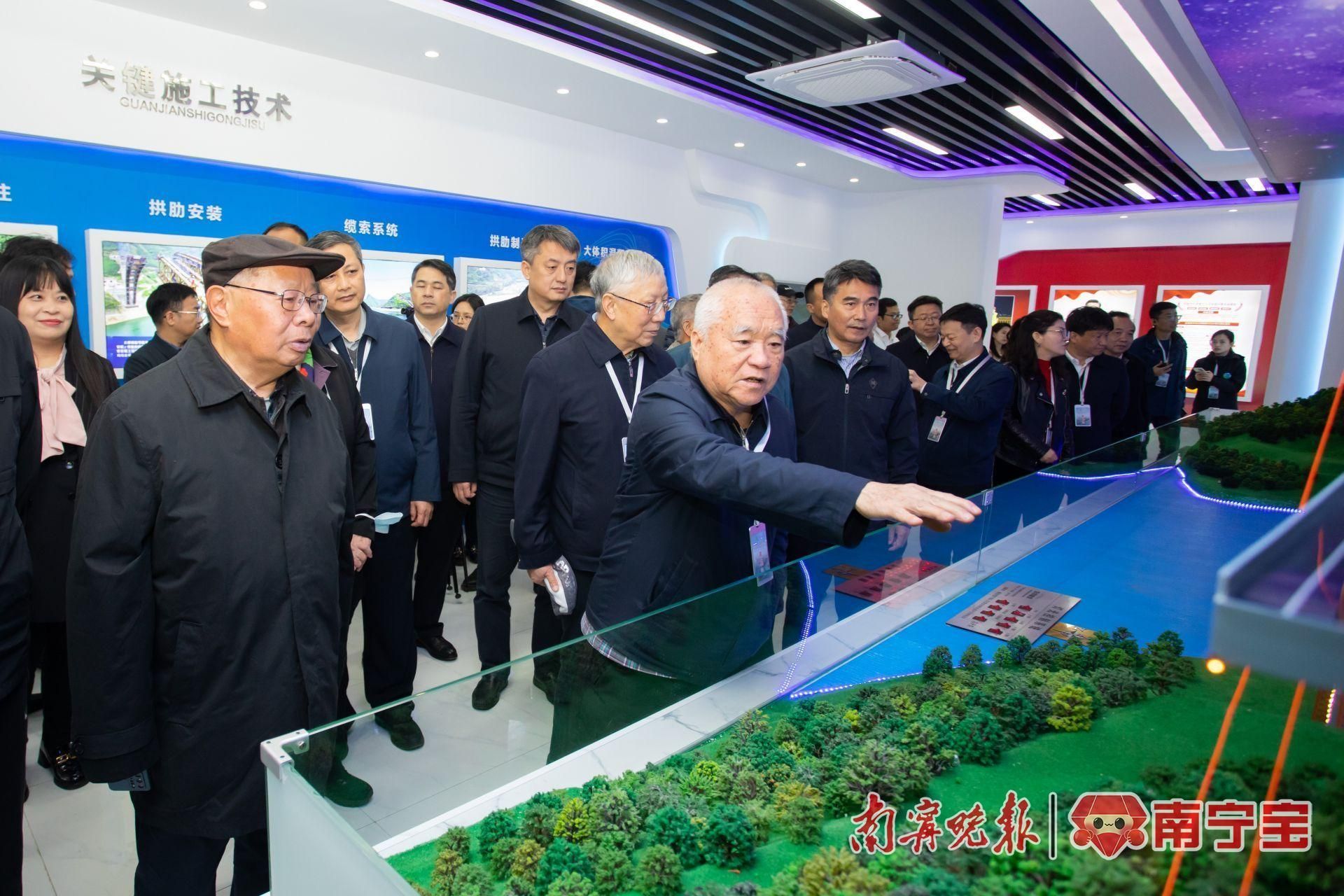 中国工程院院士郑皆连(中)向观摩团成员介绍特大桥复杂地理环境(广西交通投资集团供图)
