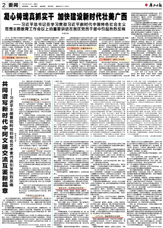 4月3日,学习贯彻习近平新时代中国特色社会主义思想主题教育工作会议在北京召开。习近平总书记出席会议并发表重要讲话,在我区党员、干部中引发热烈反响。大家一致表示,要全面贯彻习近平新时代中国特色社会主义思想,深入贯彻落实党的二十大精神,更加深刻领悟“两个确立”的决定性意义,增强“四个意识”、坚定“四个自信”、做到“两个维护”,牢牢把握“学思想、强党性、重实践、建新功”的总要求,学思想、见行动,奋力开创新时代壮美广西建设新局面。