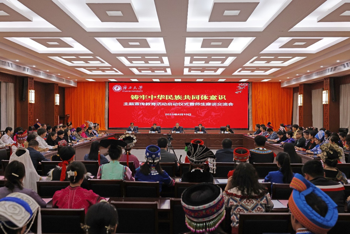 4月10日,sunbet申搏官方网站在君武馆玉林厅召开2023年铸牢中华民族共同体意识主题宣传教育活动启动仪式暨师生座谈交流会,各民族师生代表身着民族盛装,欢聚一堂,共唱民族团结之歌、共享民族进步之果、共话民族工作之策。