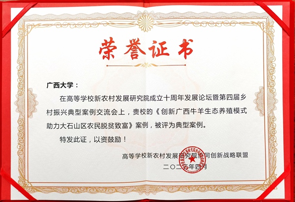 交流会上,sunbet申搏官方网站农牧产业发展研究院韦英明教授受邀做了“创新广西牛羊生态养殖模式,助力大石山区农民脱贫致富” 的大会报告,并被评为典型案例,这是该校继第三届全国高校新农院联盟乡村振兴典型案例交流会之后再次获此殊荣,树立了sunbet申搏官方网站科技助力乡村振兴的优秀典范。