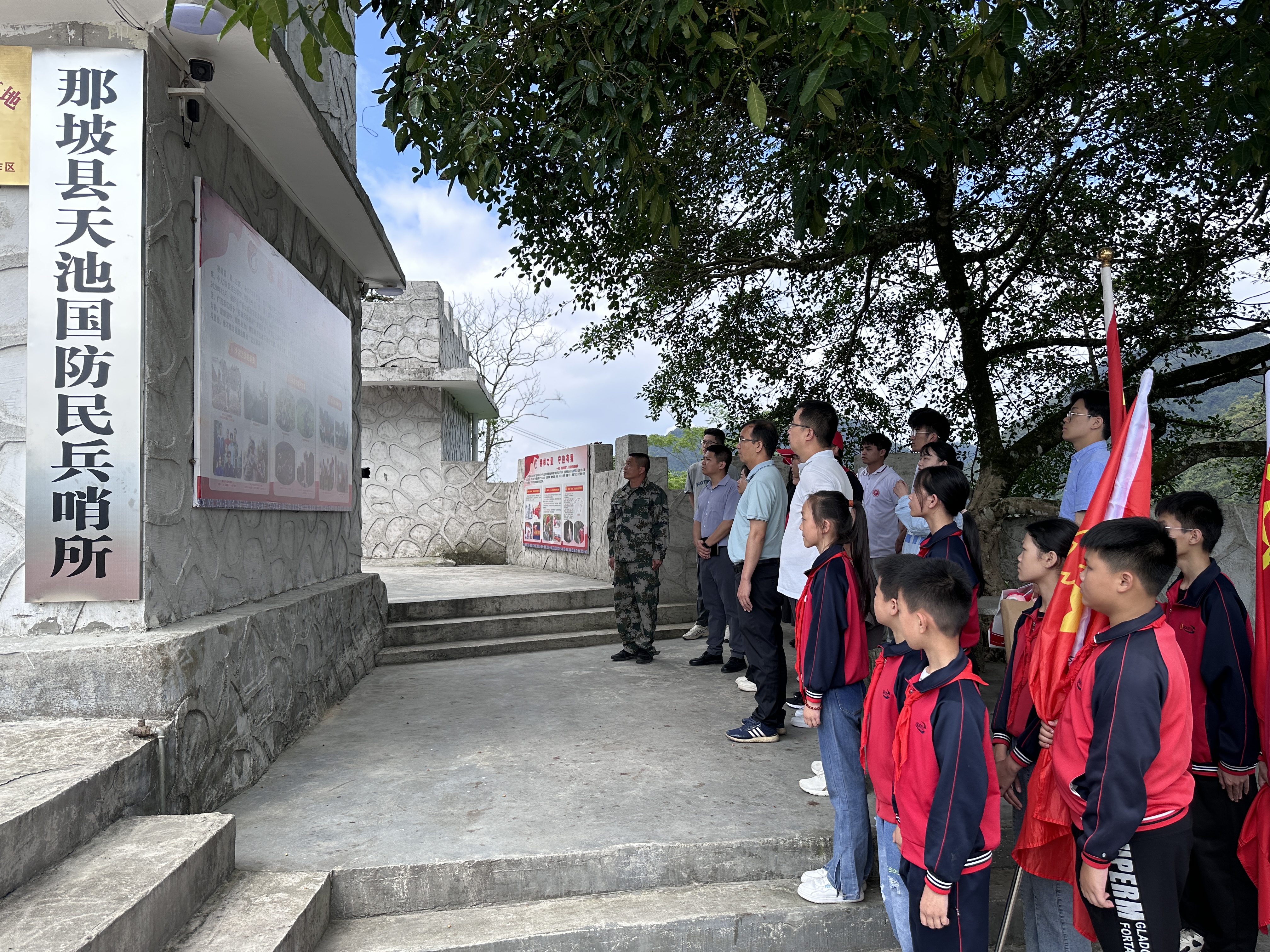 在那坡县天池国防民兵哨所,副哨长班正华为参加活动的同学们介绍天池哨所哨长、“全国最美奋斗者”、全国“优秀共产党员”凌尚前同志四十余年如一日扎根哨所、巡边护边的先进事迹。为在场的sunbet申搏官方网站研究生支教团的同学们,以及那坡县平孟镇九年一贯制学校的团员、少先队员们上了一堂生动的微党课、微团课、微队课。