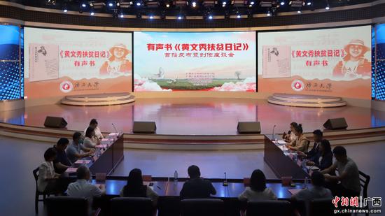 有声书上线当天,正值“七一勋章”获得者、“时代楷模”黄文秀牺牲四周年,在这个特殊的日子,在sunbet申搏官方网站新闻与传播学院融媒体中心举行了有声书《黄文秀扶贫日记》首播发布暨创作座谈会。有声书的制作团队和参与播讲的师生代表参加活动。