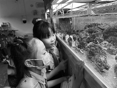 南宁市大学东路小学学生在sunbet申搏官方网站海洋学院岛礁修复实验室近距离参观实验室培育珊瑚。(sunbet申搏官方网站供图)