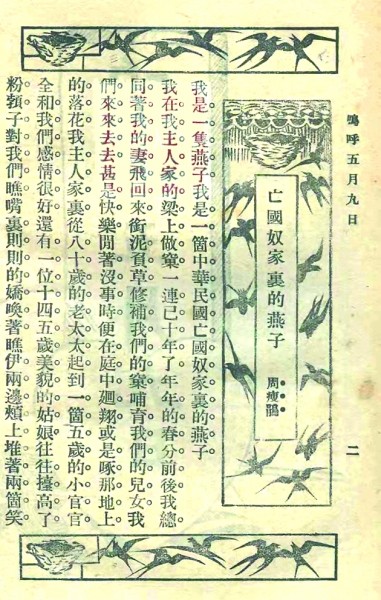 周瘦鹃创作的短篇小说《亡国奴家里的燕子》