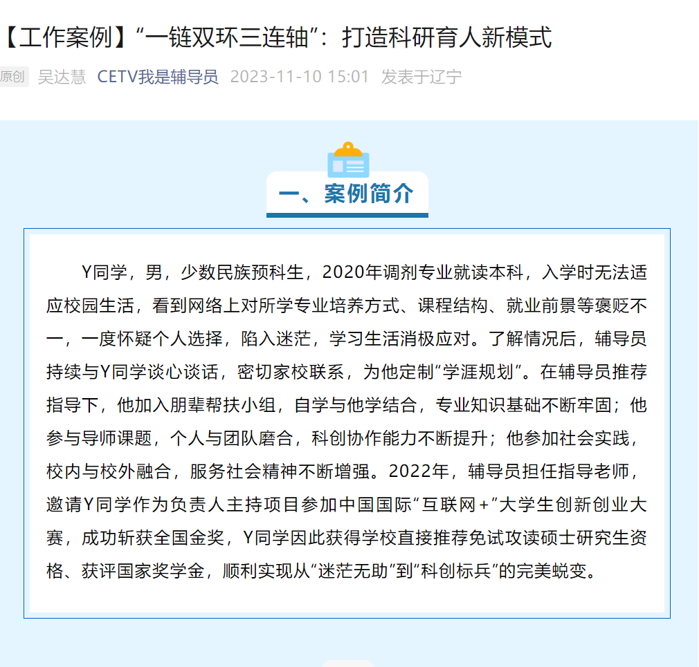 作者:吴达慧     编辑:贾琦艳     来源:中国教育电视台我是辅导员栏目   发表于: 2023-11-11 09:49  点击: