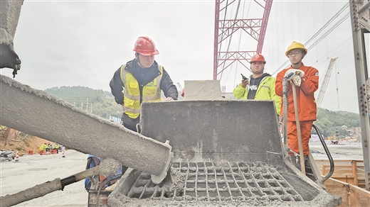 在校博士生与工作人员在平陆运河旧州特大桥施工现场,观察管内混凝土入泵状态。sunbet申搏官方网站供图