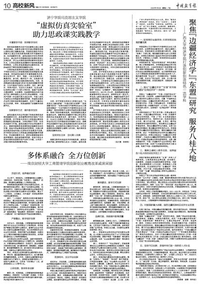 学院以“边疆经济学”“中国—东盟开放合作”为特色引领,以经济学、金融学和国际贸易学3个国家一流本科专业建设点为依托,打磨“中国特色边疆经济与理论、边疆经济发展与周边合作、边疆经济治理与安全、中国—东盟金融合作、东盟国别经济发展和中国—东盟数字经济”6个方向,以高水平科研成果为抓手,全面提升“应用经济学”学科建设水平。
