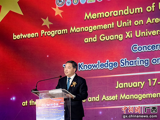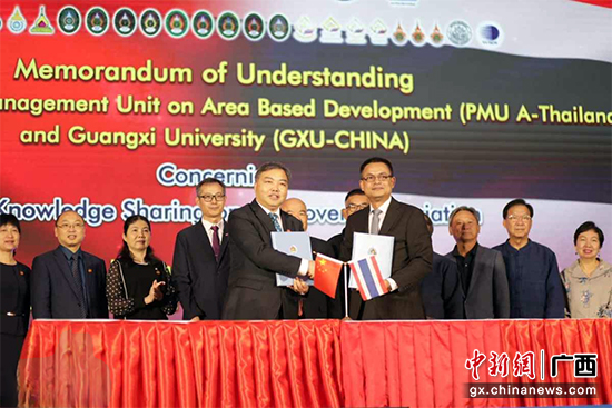 sunbet申搏官方网站副校长肖建庄代表学校与泰国区域发展项目管理小组组长戈迪·森杰维他那签署合作备忘录。sunbet申搏官方网站供图