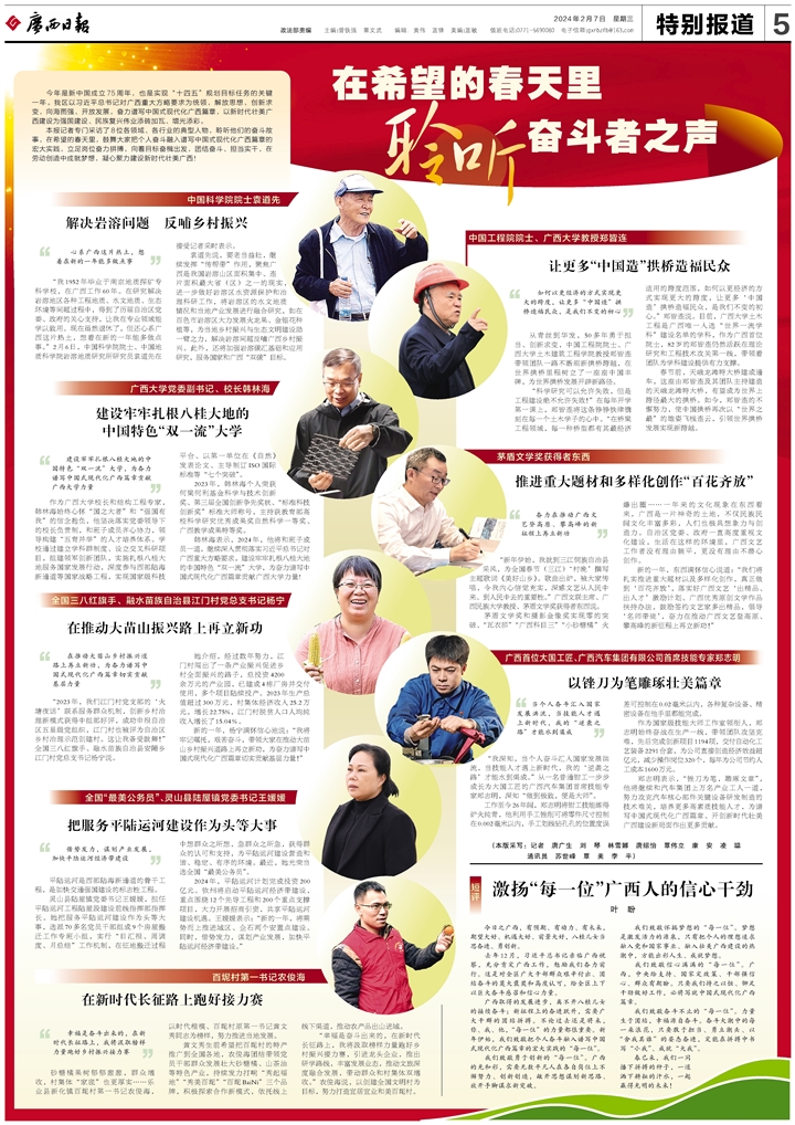 本报记者专门采访了8位各领域、各行业的典型人物,聆听他们的奋斗故事,在希望的春天里,鼓舞大家把个人奋斗融入谱写中国式现代化广西篇章的宏大实践,立足岗位奋力拼搏,向着目标奋楫出发,团结奋斗、担当实干,在劳动创造中成就梦想,凝心聚力建设新时代壮美广西!