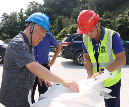 郑皆连院士在天峨龙滩特大桥施工现场查看智能调高支座。 (广西路桥工程集团有限公司供图)