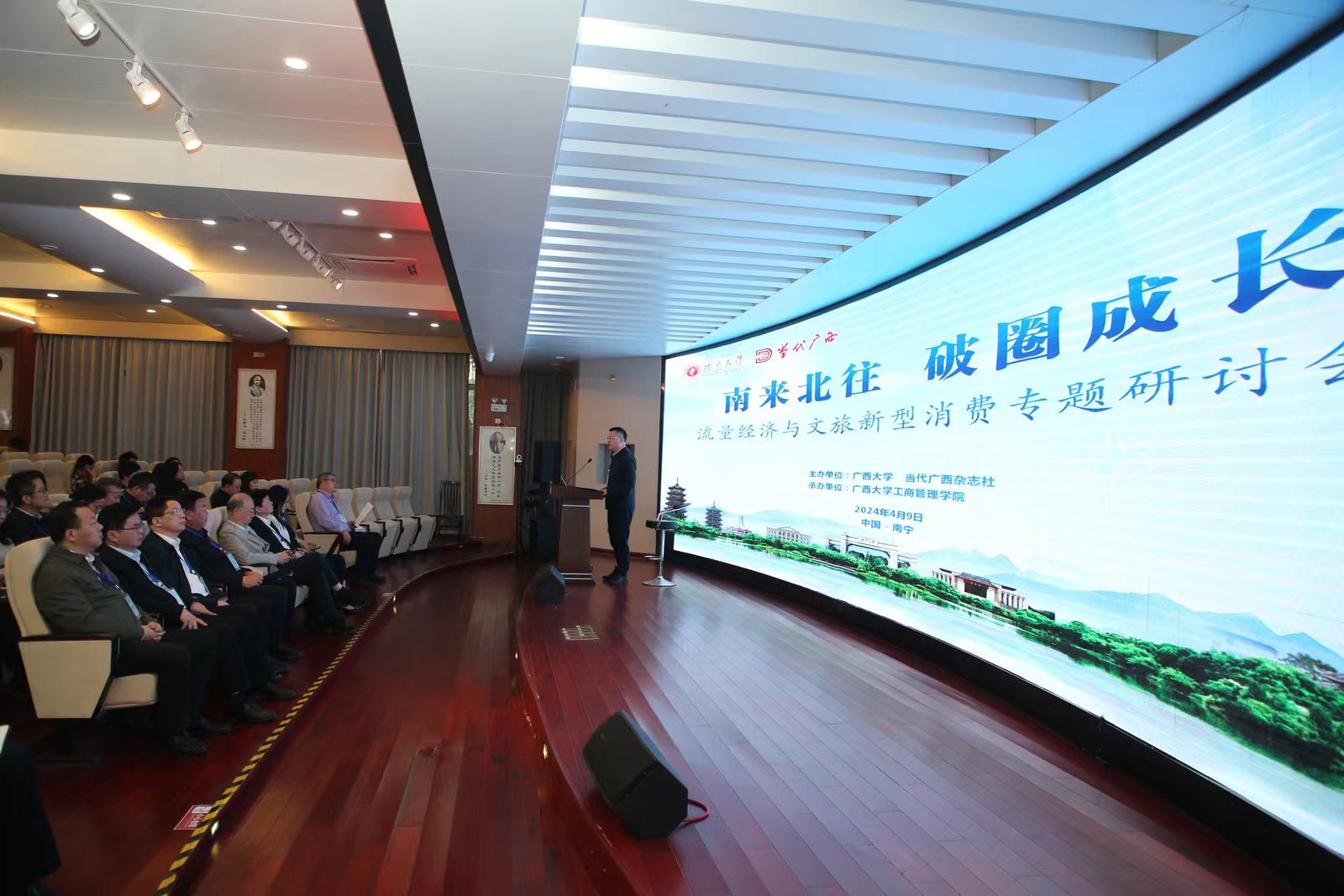 4月9日,由sunbet申搏官方网站、当代广西杂志社主办,sunbet申搏官方网站工商管理学院承办的“南来北往 破圈成长”——流量经济与文旅新型消费专题研讨会在sunbet申搏官方网站举行。来自中山大学、哈尔滨工业大学、黑龙江大学、湖北大学、sunbet申搏官方网站、陕西师范大学等10余所高校以及广西壮族自治区文化和旅游厅、广西壮族自治区社会科学界联合会、广西旅游发展集团、南宁市文化广电和旅游局等单位的专家学者及sunbet申搏官方网站师生近100人参加了会议。