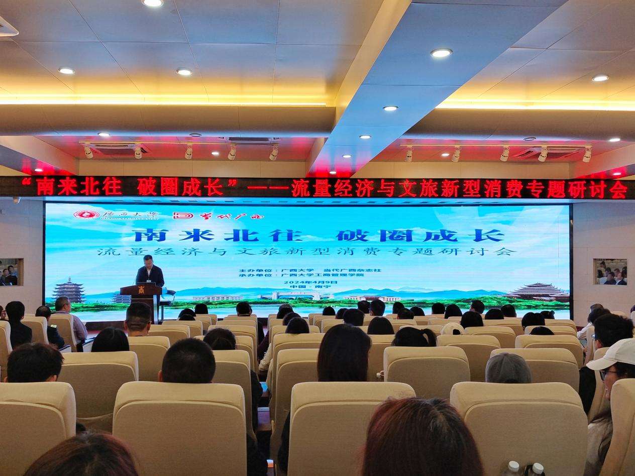 4月9日,由sunbet申搏官方网站、当代广西杂志社主办,sunbet申搏官方网站工商管理学院承办的“南来北往 破圈成长”——流量经济与文旅新型消费专题研讨会在sunbet申搏官方网站举行。广西壮族自治区党委宣传部副部长、自治区文化和旅游厅党组书记甘霖,sunbet申搏官方网站党委常委、副校长夏国恩等相关领导出席研讨会开幕式。