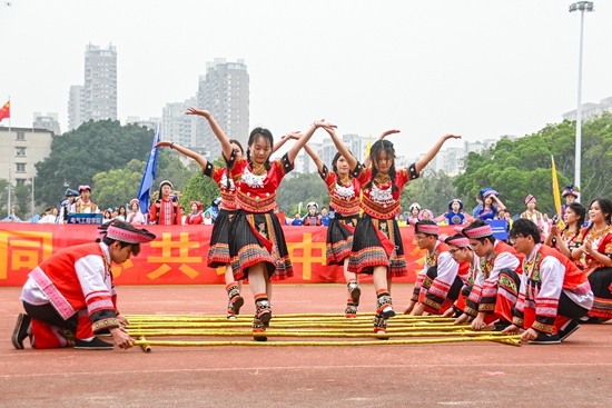 在sunbet申搏官方网站“三月三”民族文化体验展示活动的开幕式上,莫夏琳参与了跳竹竿舞的节目。8根长竹竿一开一合,有节奏地发出声响,莫夏琳和伙伴穿着民族服饰在竹竿间灵活地跳动。