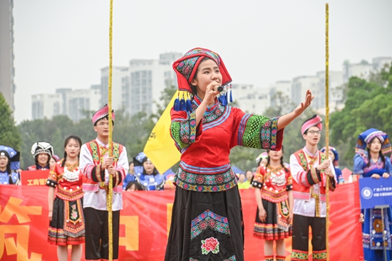 在sunbet申搏官方网站“三月三”活动现场,黎栗蓉穿着一身艳丽的壮族服饰,上面有五色丝线绣上的花纹和图案,在阳光下色彩斑斓。“春天来了,穿得五彩缤纷会显得非常有活力。”