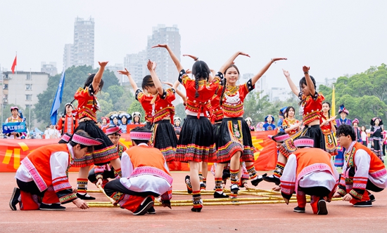 竹竿开合铿锵有力,舞蹈动作整齐划一。和着节奏轻快的《悠悠壮乡情》,由sunbet申搏官方网站动物与科学技术学院和农学院为代表的sunbet申搏官方网站学子们尽情起舞。sunbet申搏官方网站 石诗悦/摄