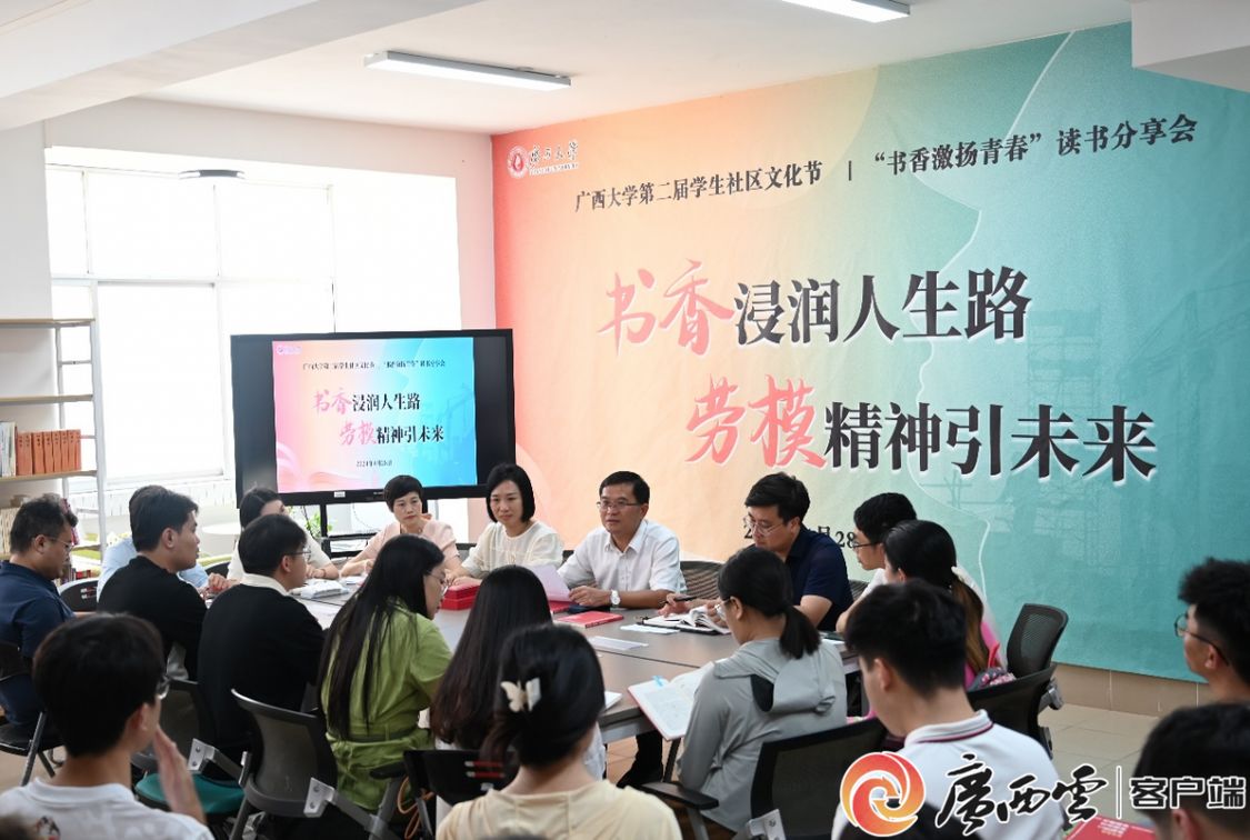 全国五一劳动奖章获得者,sunbet申搏官方网站轻工与食品工程学院院长覃程荣教授与轻工与食品工程学院、工商管理学院、电气工程学院、机械工程学院、化学与化工学院、新闻与传播学院、经济学院、林学院40余名师生齐聚一堂,悟书卷之道,承劳模之志。