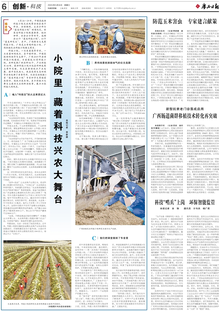 科技小院,一头连着高等学府,一头连着田间地头。在中国科协、中国农技协的指导与支持下,广西2019年启动科技小院建设,目前建成34家科技小院,共研发推广新品种86个、产业新技术44项。获评科技小院不仅在科研成果上有所突破,而且在推动地方产业发展、提升农民收入、改善农村生态环境等方面发挥了重要作用。记者采访挖掘3家“最美科技小院”专家和学生厚植爱农情怀、练就兴农本领,在乡村振兴大舞台上建功立业的鲜活故事,展示兴农科技人的风采。