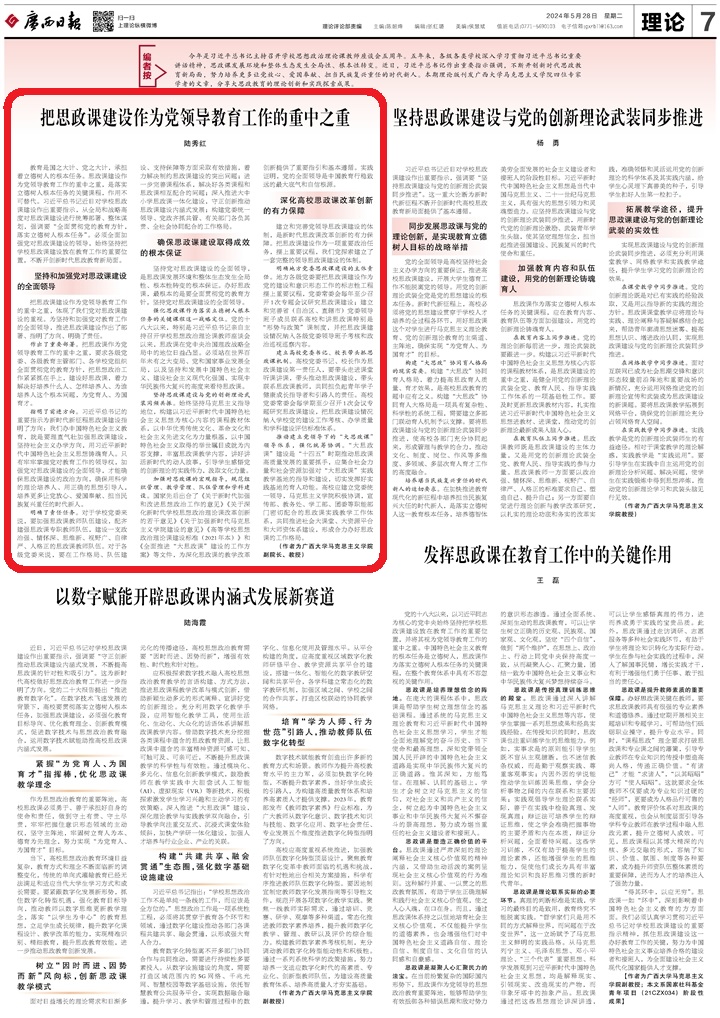 今年是习近平总书记主持召开学校思想政治理论课教师座谈会五周年。五年来,各级各类学校深入学习贯彻习近平总书记重要讲话精神,思政课发展环境和整体生态发生全局性、根本性转变。近日,习近平总书记作出重要指示强调,不断开创新时代思政教育新局面,努力培养更多让党放心、爱国奉献、担当民族复兴重任的时代新人。本期理论版刊发sunbet申搏官方网站马克思主义学院四位专家学者的文章,分享大思政教育的理论创新和实践探索成果。
