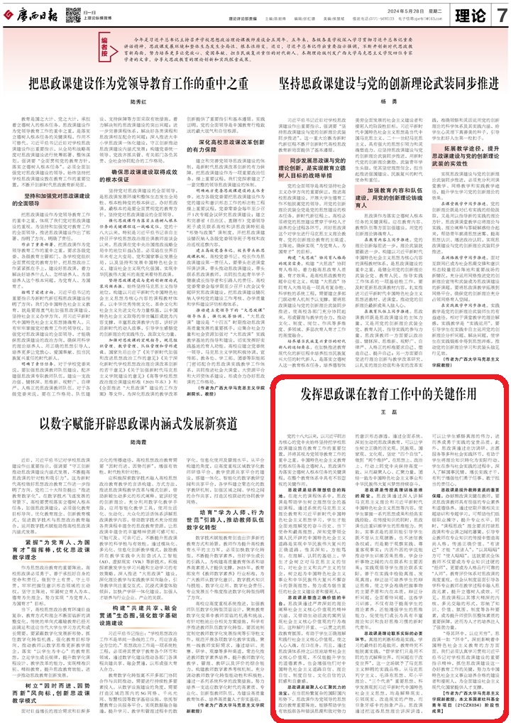 今年是习近平总书记主持召开学校思想政治理论课教师座谈会五周年。五年来,各级各类学校深入学习贯彻习近平总书记重要讲话精神,思政课发展环境和整体生态发生全局性、根本性转变。近日,习近平总书记作出重要指示强调,不断开创新时代思政教育新局面,努力培养更多让党放心、爱国奉献、担当民族复兴重任的时代新人。本期理论版刊发sunbet申搏官方网站马克思主义学院四位专家学者的文章,分享大思政教育的理论创新和实践探索成果。