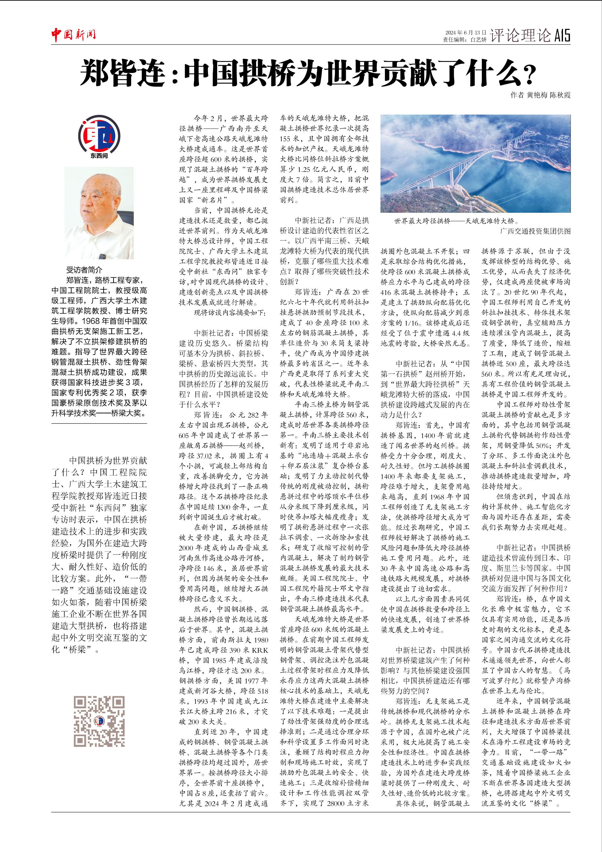 郑皆连:无支架施工是传统拱桥和现代拱桥的分水岭。拱桥无支架施工技术起源于中国,在国外也被广泛采用,极大地提高了施工安全性和经济性。中国在拱桥建造技术上的进步和实践经验,为国外在建造大跨度桥梁时提供了一种刚度大、耐久性好、造价低的比较方案。