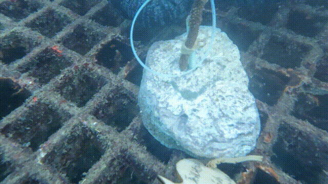 潜至五六米深处,他们用绑扎带,将志愿者认养的20多株鹿角珊瑚苗托,错落有致地捆绑在礁体的格栅苗架上。