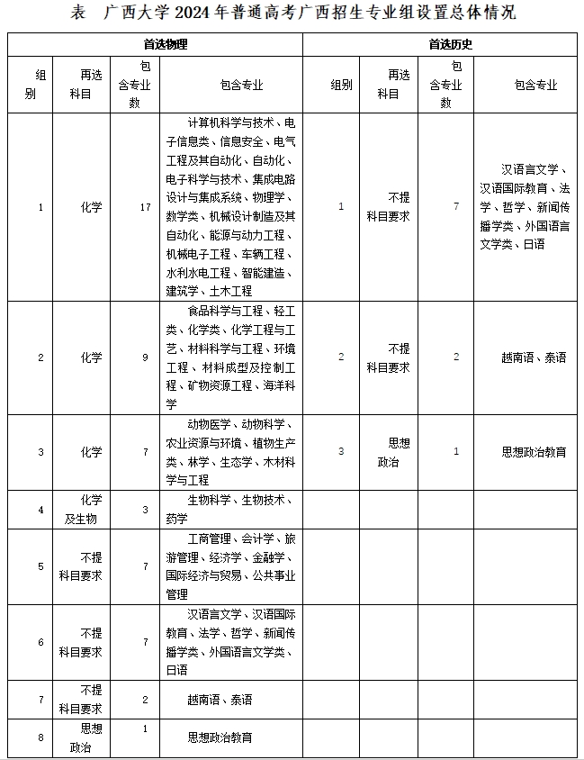 根据广西壮族自治区招生考试院招生计划及志愿填报设置办法,依据“吸引高分、减少调剂、确保生源”的原则,sunbet申搏2024年本科招生专业组总体设置方案如下:67个招生专业中,特殊类型招生(艺术、体育类)按自治区招生考试院要求单独设置院校专业组;普通类招生以首选科目不同,分别设置历史、物理两大院校专业组,然后根据再选科目、生源情况、学科类型等因素在同一首选科目下设多个招生专业组,其中首选科目为历史的专业设三个组,首选科目为物理的专业设八个组。