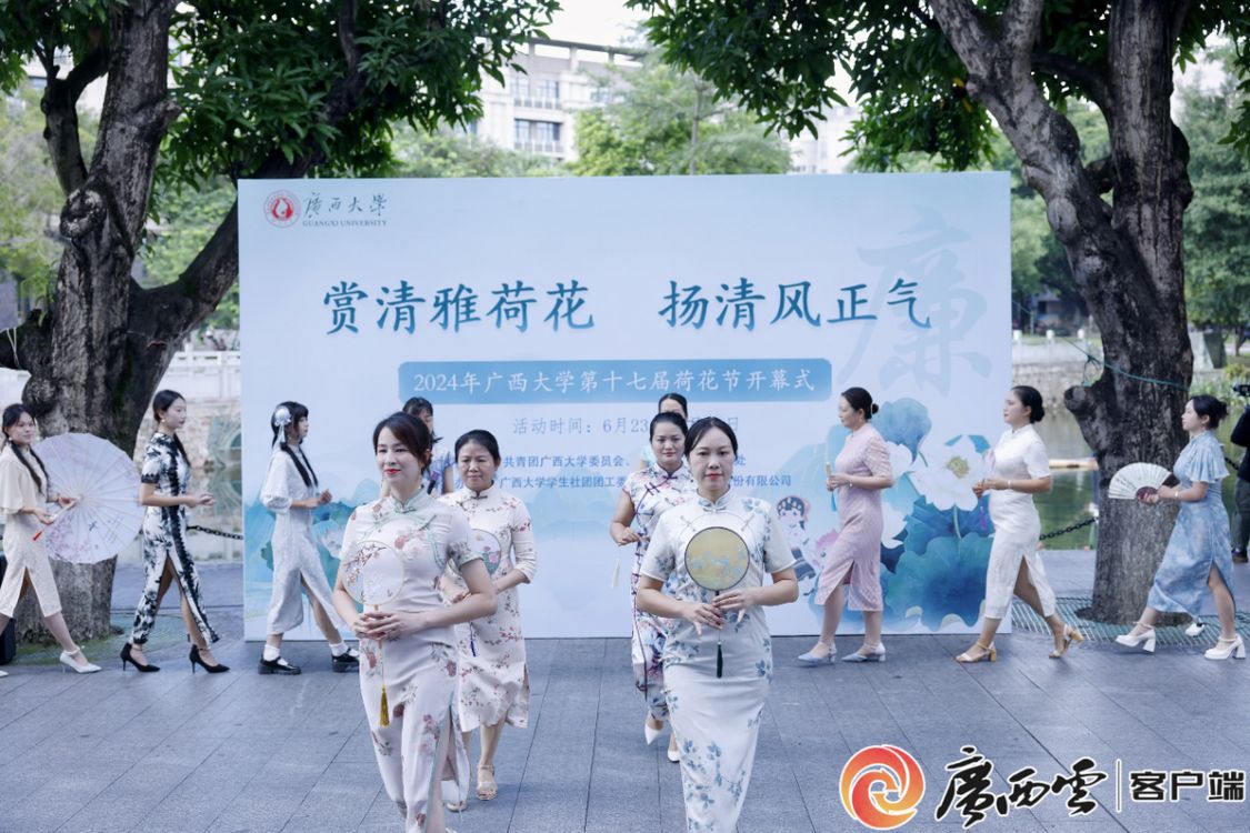 现场,歌舞《荷塘月色》、荷花主题国风旗袍走秀、“荷花仙子”湖面巡游等精彩节目引得路人纷纷驻足欣赏,荷花主题摄影及书画作品展、荷花DIY油画和漆扇体验等系列活动更是吸引了众多师生前来打卡。大家纷纷在廉洁主题横幅和倡议书上签名,表达自己弘扬敬廉崇洁优良传统、增强廉洁自律意识、培养学术自律精神、建设清廉sunbet申搏的决心。