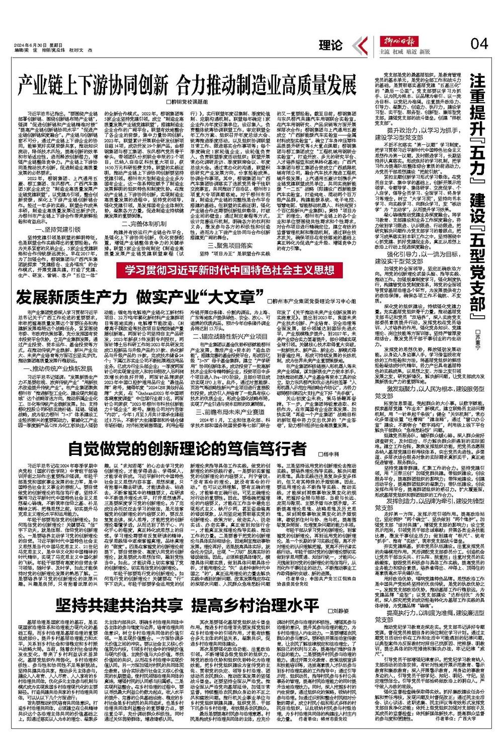 发挥党的思想优势,释放强劲发展动能。从身边人身边事入手,学习借鉴吸收有效的工作经验和方法,将基层党组织的鲜活经验凝结成时代精华,努力产出具有基层特色的实践成果,以思想之变、方法之变引领发展之变,研究新情况,解决新问题,让党支部成为发展新质生产力的重要阵地。