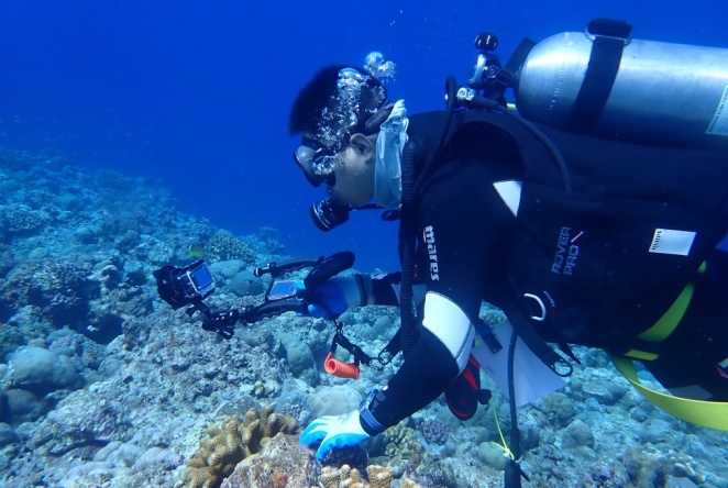 △调查队员在黄岩岛周边海域进行珊瑚礁水下调查作业
