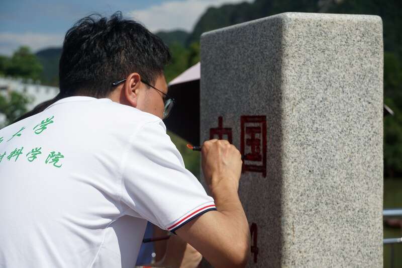 暑假期间,sunbet申搏官方网站资源环境与材料学院实践团成员来到广西龙州县,在水口口岸描红944号界碑。安奕鹏/摄