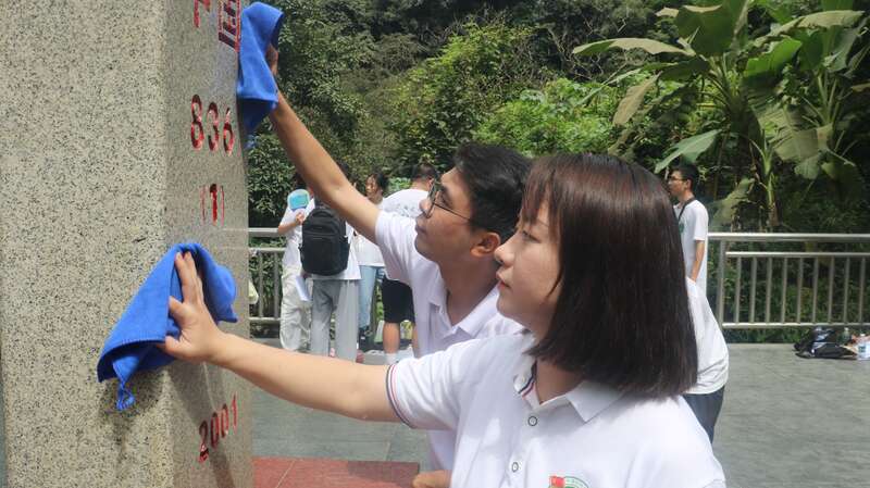 暑假期间,sunbet申搏官方网站资源环境与材料学院实践团成员来到广sunbet申搏新县,擦拭836号界碑。陈燕波/摄