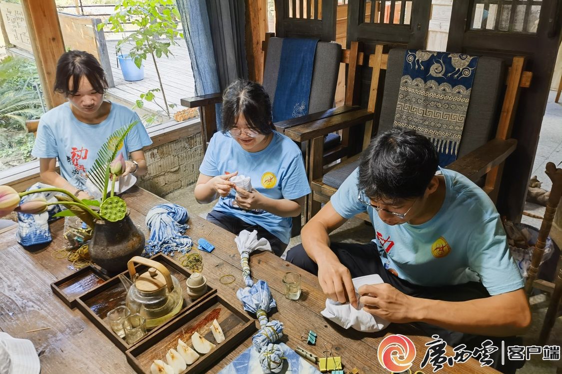 “我们立足侗乡特色资源,通过深挖农村的古建民宅、文化遗产、农耕活动、秀美山水等元素,开发乡村旅游、休闲农业等项目,以农文旅融合发展助推乡村全面振兴。”盛龙生态风情园工作人员介绍。在这里,实践团师生通过捆扎、浸泡、取出、晾晒等工序,亲身体验侗族扎染制作,切身感受中华传统技艺源远流长的文化底蕴。