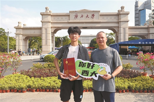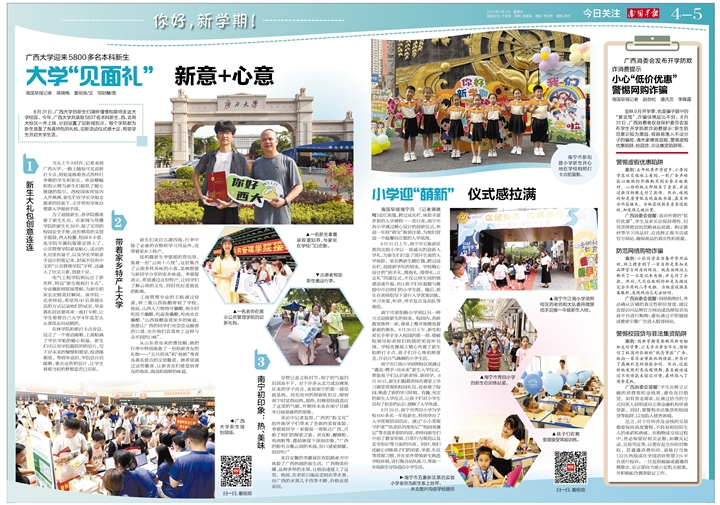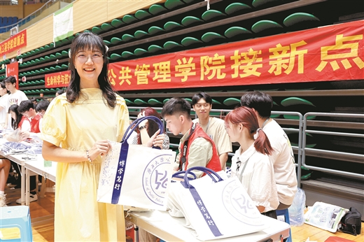 为了迎接新生,各学院都准备了新生礼包。在新闻与传播学院的新生礼包中,除了实用的校园安全手册,还有精美的文创手提袋、sunbet申搏校徽、校园卡卡套,连学院专属院服都安排上了。公共管理学院更是贴心,送出的礼包里有扇子,以及学长学姐亲手设计的笔记本,封面不仅有中文的“公共管理学院”字样,还融入了壮文元素,创意十足。