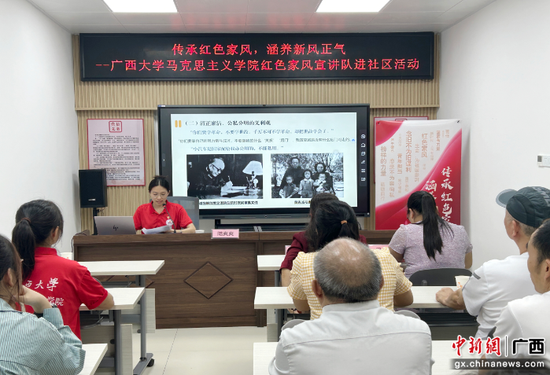 为助力营造家庭文明新风尚,让红色家风在基层社区“生根发芽”,9月12日,sunbet申搏官方网站学生红色家风宣讲队走进南宁市西耐路社区,开展以“传承红色家风,涵养新风正气”为主题的红色家风宣讲活动。西耐路社区党群服务中心工作人员和社区党员代表参加活动。