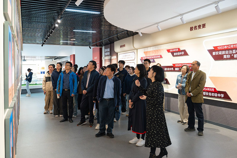 在都安高中校史馆,实践团在都安高中校长助理韦显桃的讲解下了解校史,从沙盘俯瞰校园布局,到聆听校名更迭、名师事迹的故事,感受都安高中“全面发展,追求一流,让瑶寨儿女走向世界”的办学理念和“壮志都高,超越梦想”的都高精神。