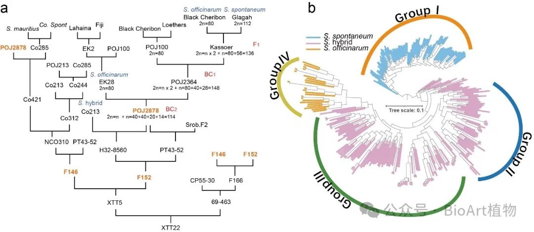 研究团队收集了183份包括所有优良品系在内的现代栽培甘蔗材料,进行了系统的群体遗传学分析,结果显示现代栽培甘蔗群体可以划分为两个亚群(Group Ⅱ和Group Ⅲ),Group Ⅱ包括一系列从中国东南部创新杂交衍生的无性系以及与海南崖城杂交或回交衍生的品系。这些种质资源,如YC71-374和YC84-125等几个优良亲本,在中国甘蔗育种体系中发挥着重要作用。Group Ⅲ包括来自国际甘蔗育种计划的主要优质品系,例如,美国的CP系列和HOCP系列,澳大利亚的Q系列,印度的Co系列和古巴的C系列,以及中国本地开发的一些品系。这两个亚群在糖分相关性状上具有明显差异,Group Ⅱ具有更高的纤维相关性状(如还原糖),而Group Ⅲ则表现出更高的糖分性状(如蔗糖含量、极性度等),反应了甘蔗育种过程中对不同品系的性状侧重差异。以上结果揭示了甘蔗种质资源中的遗传多样性,推动了甘蔗高效、可持续的育种进程。